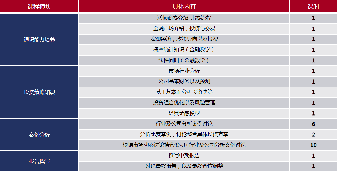 每一个团队负责管理10万元美金的虚拟现金,在10周的时间里使用沃顿商学院的线上交易模拟系统(Wharton’s online Trading and Investment Simulator, OTIS)进行投资组合管理和交易。**终实施自己的投资方案并形成**终报告(Final Strategy Overview)作为参赛作品。