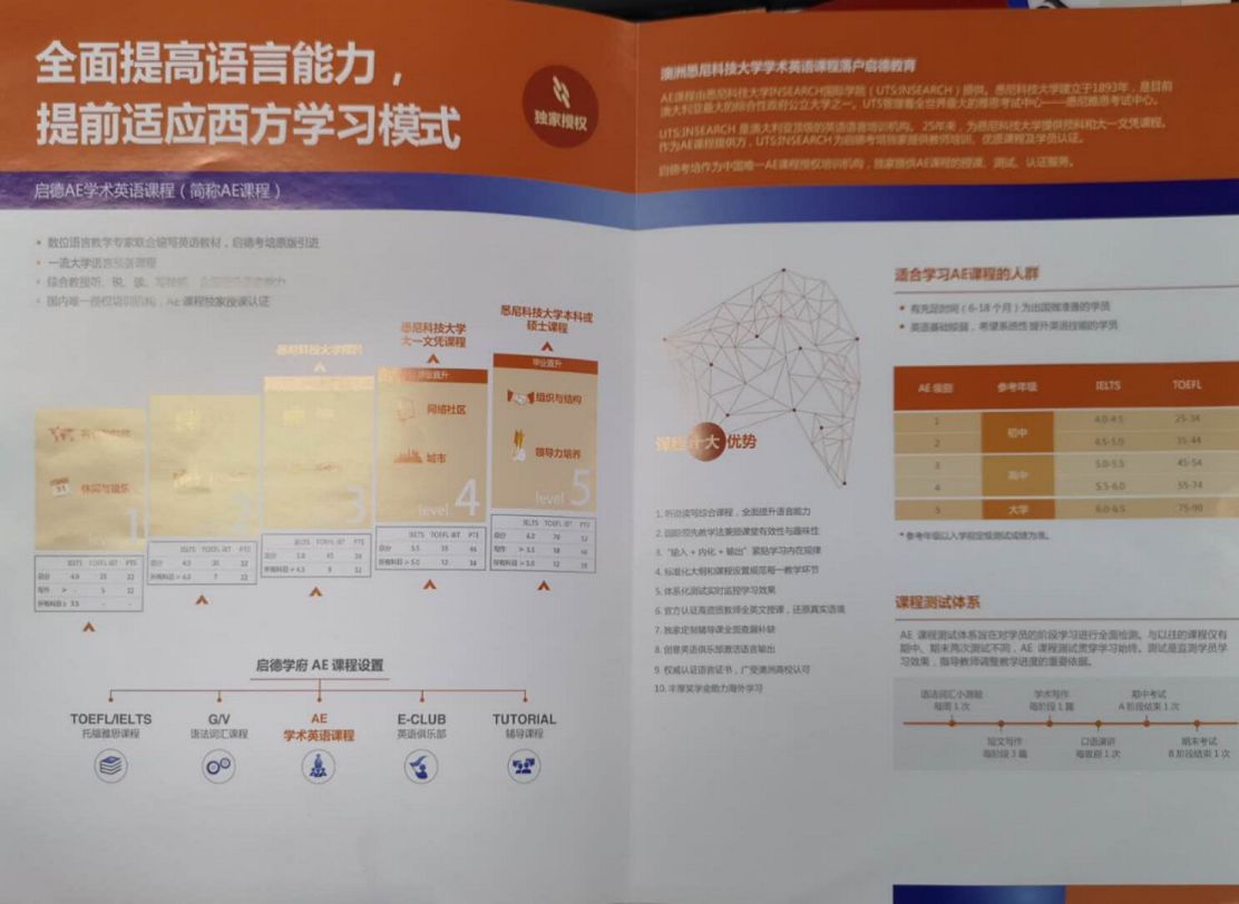 AE课程由悉尼科技大学(UTS-University of Technology, Sydney)的INSEARCH国际学院提供。悉尼科技大学建立于1893年,是目前澳大利亚**的综合性政府公立大学之一。 UTS管理着全世界**的雅思考试中心之一——“悉尼雅思考试中心”。 UTS: INSEARCH是澳大利亚顶级的英语语言培训机构,25年来,凭借一流的国际课程为学员提供优质服务。作为启德考培AE课程的提供方,UTS: INSEARCH同时提供悉尼科技大学的预科和大一文凭课程。