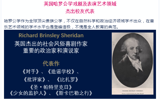 英国哈罗公学拥有悠久而充满活力的戏剧传统,培养的演艺界名人才子包括理查德·布林斯利·谢里丹(Richard Brinsley Sheridan)、约翰·戈尔斯沃西(JohnGalsworthy)、特伦斯·拉蒂根(TerenceRattigan)、约翰·莫蒂默(JohnMortimer)和理查德·柯蒂斯(Richard Curtis)等剧作家,以及包括加里·埃尔维斯(CaryElwes)、詹姆斯·德雷福斯(James Dreyfus)、蒂莫西·本丁克(Timothy Bentinck)和本尼迪克特·康伯巴奇(Benedict Cumberbatch)在内的演员。